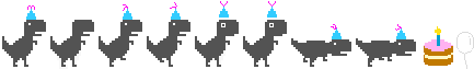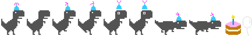 Nhấp nút phía trên để tham gia cuộc chạy sinh nhật đặc biệt! Dẫn dắt T-Rex qua sa mạc lễ hội, thu thập bánh để đội mũ tiệc, và để mắt tới những quả bóng bay bay lượn khi bạn săn đuổi điểm số cao mới.